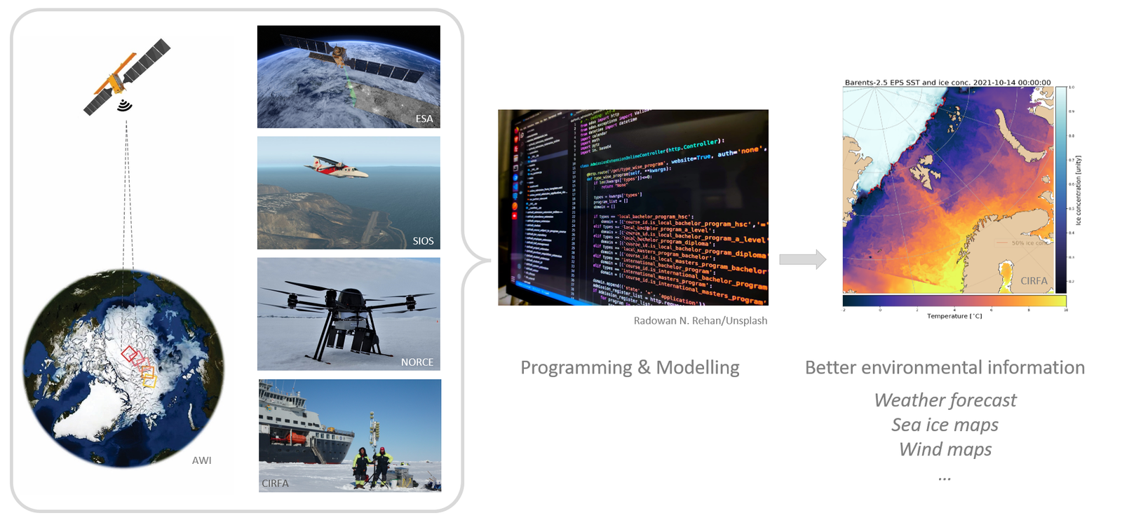 CIRFA researchers and partners use programming and algorithms that analyse large datasets. Combined with direct observations and models, the results improve forecasts of various ocean surface conditions, as well as uncertainty estimates.