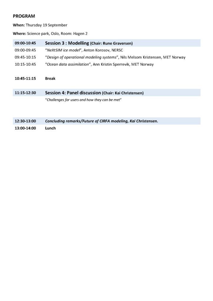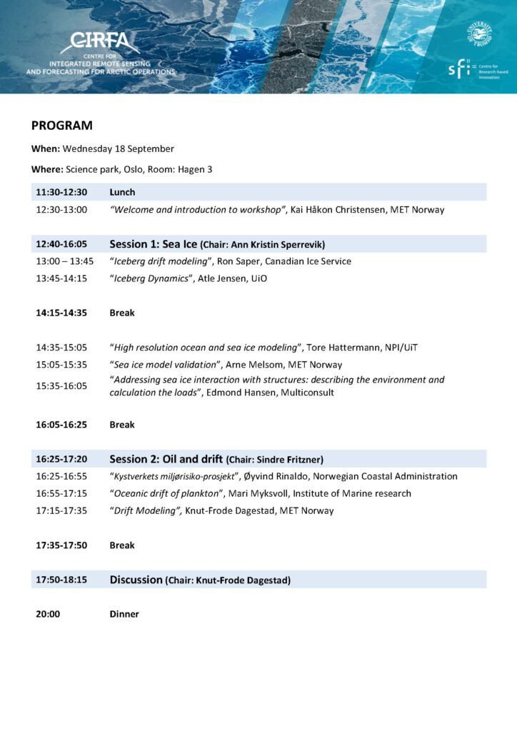 Centre for Integrated Remote Sensing and Forecasting for Arctic Operations (CIRFA) is pleased to invite to a thematic workshop Sep 18-19 with focus on modelling.